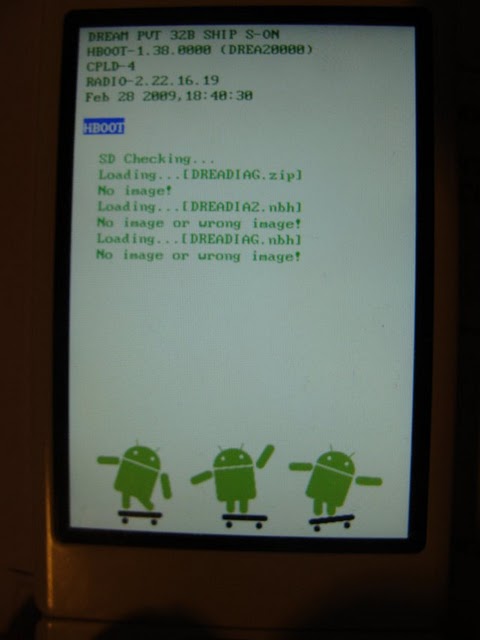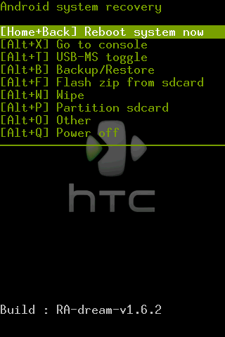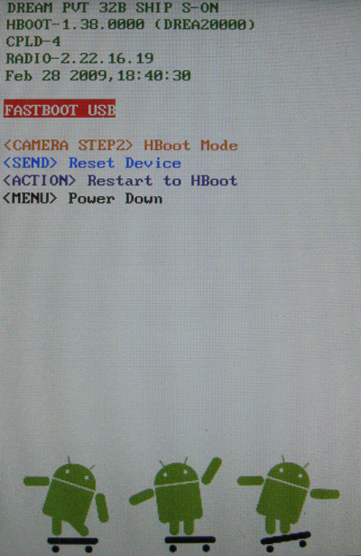 Note : le mode HBOOT est un raccourci qui va chercher directement un fichier appelé DREAIMG.nbh. Il est possible de le démarrer en passant d'abord par le mode Fastboot.